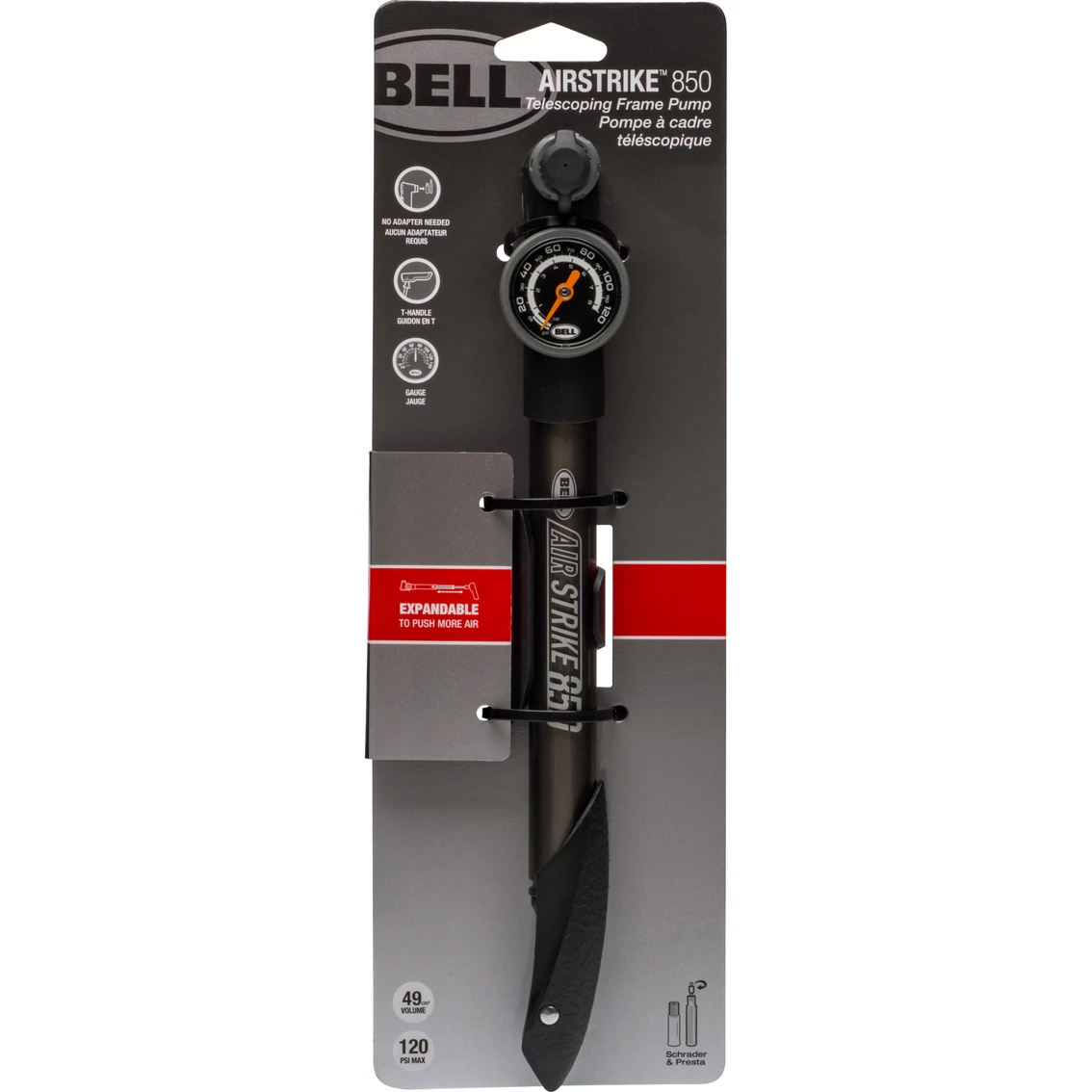 Bell Sports Air Strike Series frame pumps provide a quick, easy solution for inflating your tires or fixing a flat on the road or trail. Compact and lightweight, this high-pressure and high volume frame pump has a 120 psi max. Smart valve fits both Presta and Schrader valves without any adaptors. The pump has a folding, soft-touch T-handle and integrated pressure gauge.