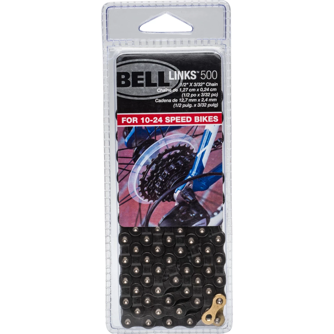 The Bell Sports Links 500 Multi Speed Chain fits 10 to 24 speed bicycles measuring 1/2 x 3รขยย32 in. with 112 links. Master link included-easy to install. Requires chain repair kit to lengthen or shorten chain. Model: 7122147.