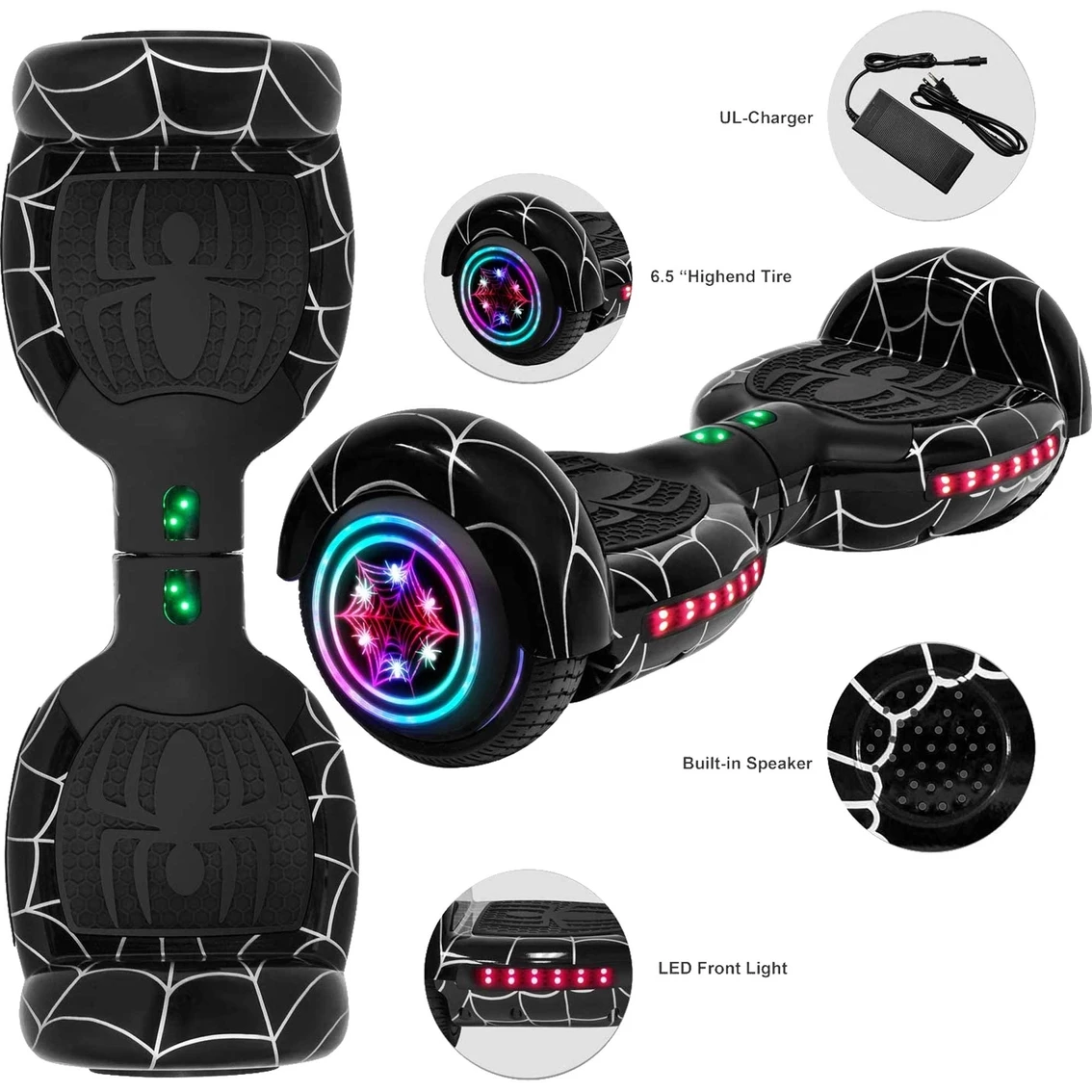 Connect to your on-board speaker via Bluetooth and enjoy your favorite music through your stereo speaker with premium sound quality while riding. It can connect from your laptop, iPhone, or any other Android device. Colorful LED Light up spider wheels UL certified: hoverboard meets UL2272 standards for quality charging and electrical performance. Easy to learn and maintain. The Self balancing technology of the hoverboard makes it easier and safer for beginners and amateurs. Max Speed: 6 mph Distance: 8 miles Wheel Size: 6.5” Weight Limit: 165 lbs Charging Time: 2 Hours Bluetooth
