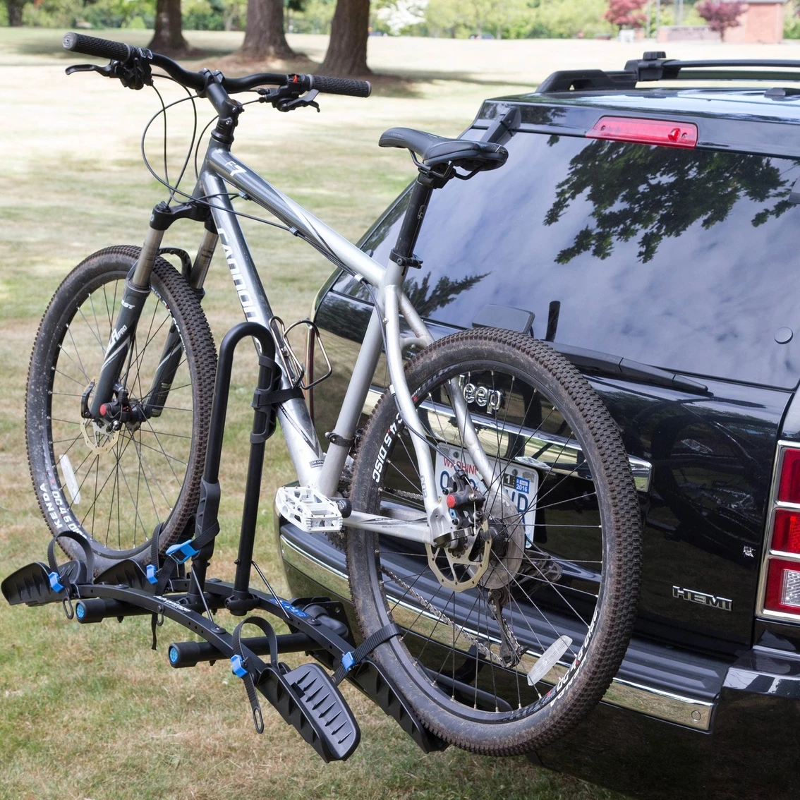 Down-to-earth design loads quickly and easily. Durable, rust-resistant construction. Comfortably carries one or two bikes, up to 33 pounds (15kg) each. Folds for on-vehicle stowage or garage storage.