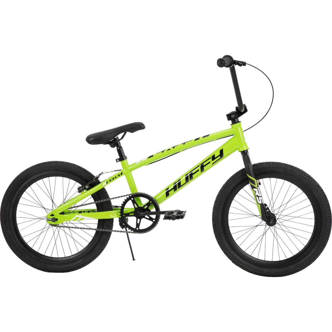 This 20″ Huffy BMX Race Bike has attitude and style. The bright Green frame, matte black graphics, and alloy double wall rims have a sleek look. Plus, a pro geometry handlebar with 4-bolt stem adds performance to this racy bicycle. The durable steel BMX frame is suited for riding on level surfaces as well as uphill and downhill roads. Rear alloy linear brakes help the rider learn to stop with confidence. Resin BMX pedals, Krayton grips and add performance and comfort to this bike. Lightweight alloy double wall rims add strength to every ride. Steel race frame with Pro geometry in Bright Green with Matte Black graphics. Pro geometry handlebar with 4-bolt stem provides superior control. Sealed and integrated headset maintains bearings for superior performance. Lightweight, double-wall aluminum rims with 36-spokes. Rear alloy linear pull brakes. Slim, railed BMX-style seat with quick release to adjust seat height.
