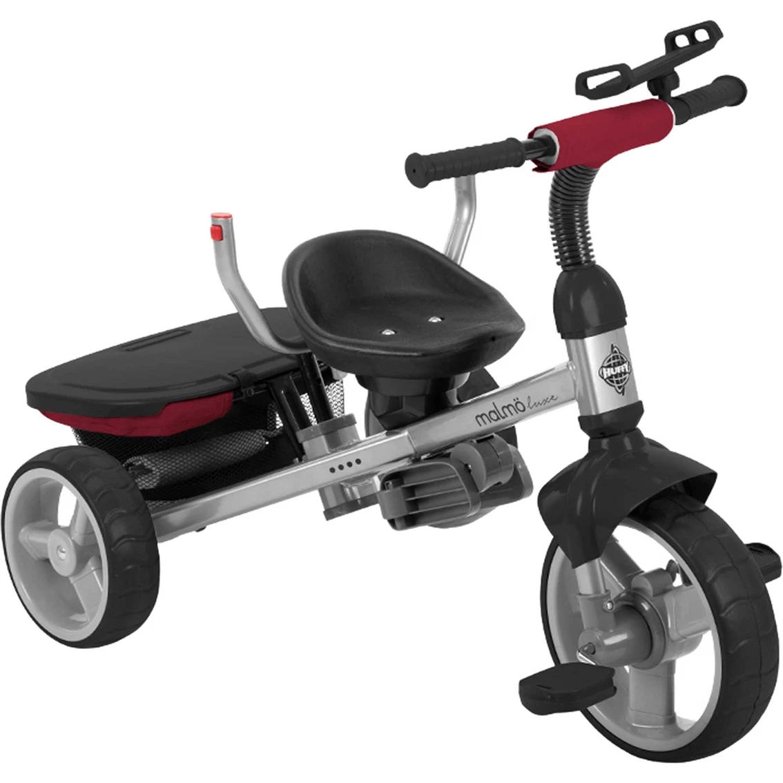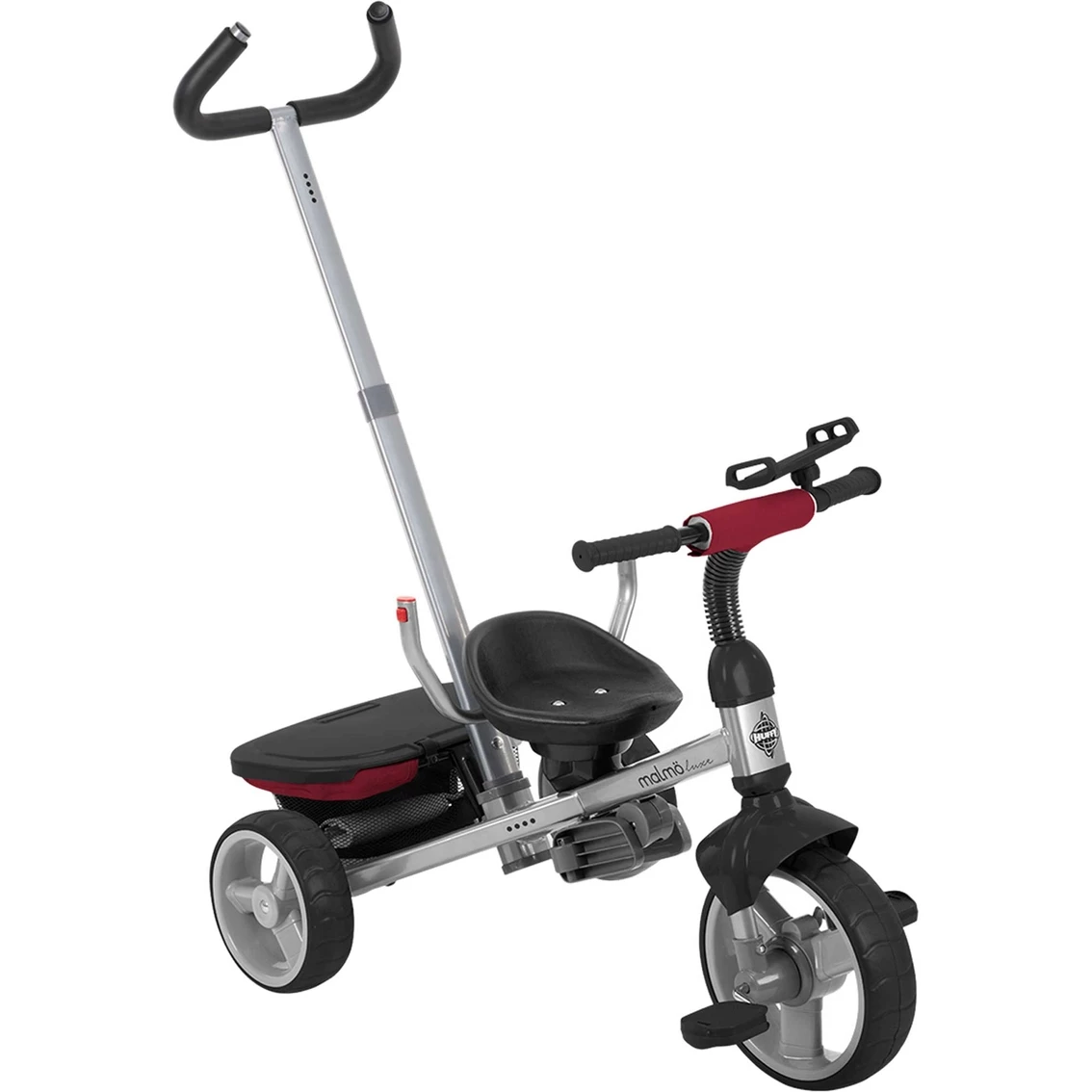 Huffy designed this Canopy Trike with βLuxeβ for parents and kids. The Malmo Luxe easily converts into four products. Itβs the perfect way to introduce trikes to kids! Stage 1 features a deluxe canopy which adjusts to the childβs comfort. The deluxe padded seat insert with 3-point harness pivots so the child can face forward to see ahead, or backward, to see who is pushing the ride. The seat also has a wrap-around handlebar for the child. As the child grows, you can convert the trike to Stage 2, removing the wrap-around handlebar. In Stage 3, the child is ready to remove the canopy and seat insert, so the child can sit in the tricycle seat and start learning to pedal. The parent steer bar stays on, while steering is learned. Stage 4 means It’s Time to Roll! The child understands how to steer and ride the trike. Remove the parent steer bar and let the memories begin! Durable steel frame trike includes deluxe covered storage, smartphone and cup holders for convenience. The childβs handlebar includes a holder for a tablet. Ages 1.5 to 3; maximum weight 60 pounds.