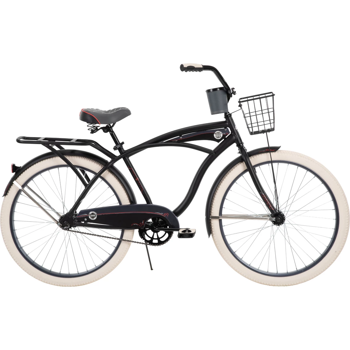 For comfort, style and convenience, the Huffy 26-inch Deluxe cruiser wins! The exclusive Perfect Fit frame is uniquely designed for superior comfort. Hop on and youโll immediately notice the difference. The frame provides a natural riding position, which benefits your back, arms and hands. The padded spring saddle, dual density grips and pedals, and an easy-to-use coaster brake make this one-speed cruiser truly deluxe. Extra features deliver more convenience – your favorite beverage fits in the handlebar cup holder; the roomy front basket is a great place to stash your keys, phone and jacket; and the rear rack is perfect for transporting books or work items. In your quest for fun, this handsome bike will take you where you want to go.