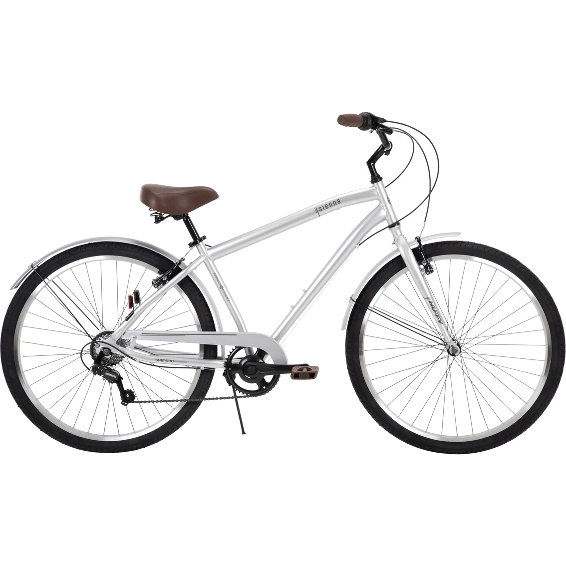 The Matte Silver Sienna Hi-ten steel Perfect Fit frame delivers comfort as soon as you hop on the bike. Designed to fit your natural riding position, the frame design benefits your back, arms and hands. The deluxe padded spring saddle and dual density grips and pedals ensure each ride feels great from start to finish. Fenders keep dirt and water away while you ride. Hop on the Huffy Sienna and experience a great adventure every time you ride.