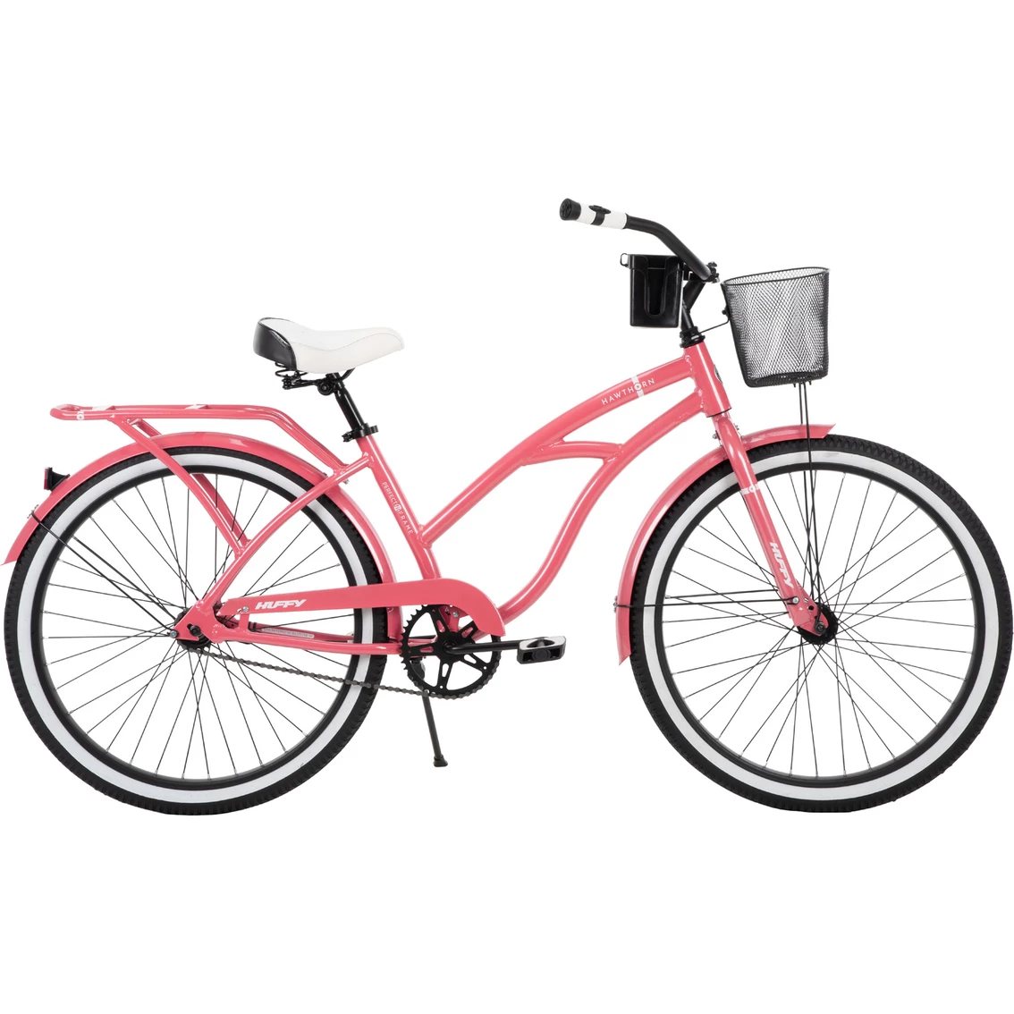 Whether you are cruising to the market, heading to the beach, or having a relaxed spin around the neighborhood, the Women’s Hawthorn cruiser from Huffy will get you there in comfort and style. The lightweight aluminum frame features Huffyโs comfortable Perfect Fit geometry, as well as a beverage holder, basket and comfortable spring saddle, making the journey as fun as the destination.