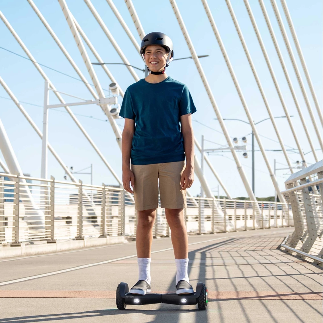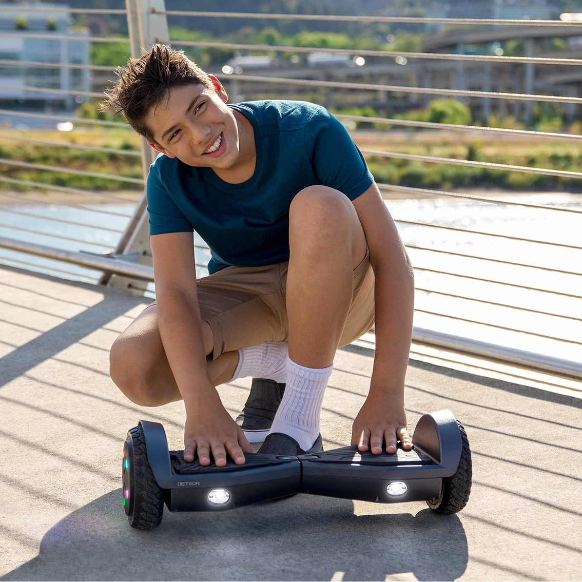 You will feel like you are floating on air when you take the Jetson Aero Hoverboard out for a spin. The Jetson Aero Hoverboardβs Active Balance Technology makes riding foolproof for even the most novice riders. It uses internal sensors that balance the board to keep you level and stable as you ride. Sparkle as you spin and bring all the flair with the Aeroβs customizable light-up wheels that shine bright colors as you ride. The Jetson Aero Hoverboard lets you feel good and look good. But do not be fooled by the Aeroβs beautiful design, the Aero comes with a deceptively powerful 300 dual watt motor that runs on electric power will have zipping around the neighborhood. The Jetson Aero Hoverboard also comes with all terrain tires that means that you take it wherever you are going, the Aero is one hoverboard that is built to handle whatever you throw at it.