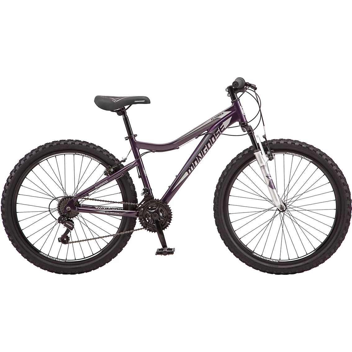 Explore rad new trails with the FlatRock mountain bike by Mongoose. The FlatRock comes equipped with a lightweight aluminum hardtail frame and Element suspension fork that are ready to tear down the trail. 21-speed twist shifters and rear derailleur provide effortless gear changes, while alloy v-brakes deliver reliable stopping power. Plus, double wall alloy rims offer lightweight durability. Get out there and explore with the Mongoose FlatRock.
