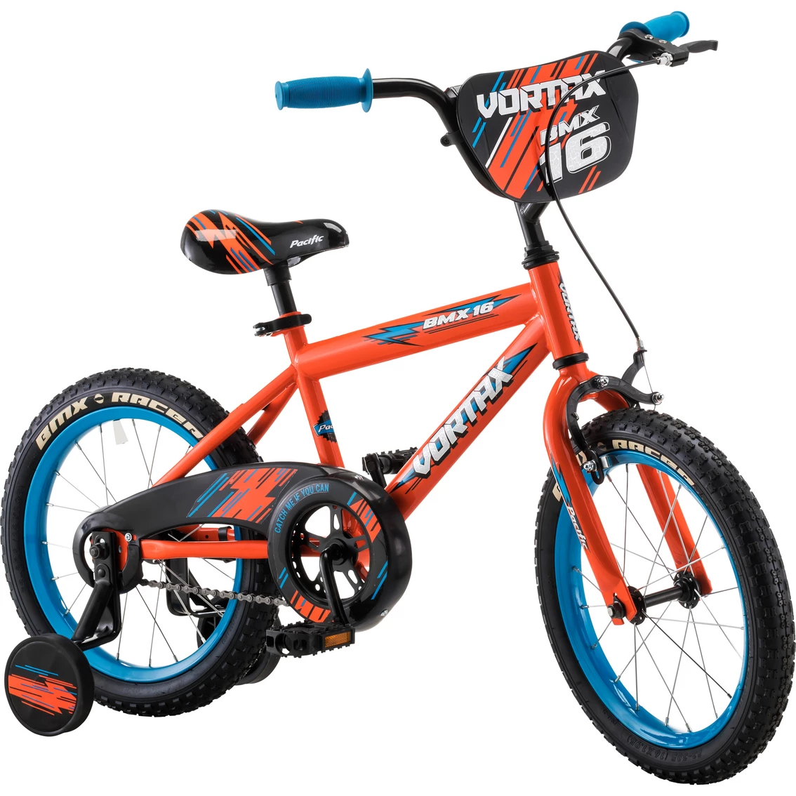 Learning to ride is loads of fun with the Vortax Kids Bike by Pacific. The Vortaxβs durable steel frame features fun colors and rad graphics your child will love. The single speed drivetrain is easy to use and simple to maintain, while the rear coaster (pedal) brake provides intuitive stops. Plus, the removable training wheels offer extra stability while your child learns to ride. Teach your child to ride on one of the coolest bikes in town with the Vortax by Pacific.