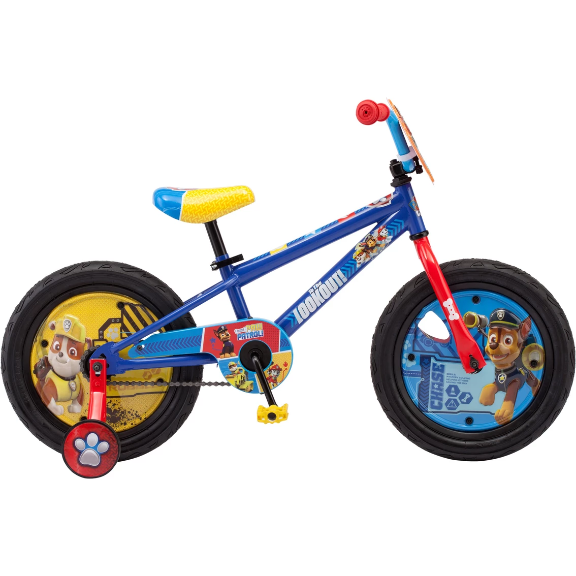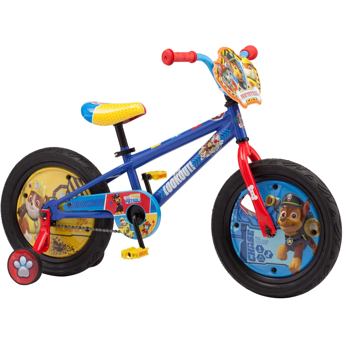 If danger is near, just give a yelp, the PAW Patrol is here to help! It’s time to save the day: Ride into the action on the PAW Patrol Boys 16 in. sidewalk bike! This multi-character bike takes the fun of PAW Patrol, combines it with the excitement of learning to ride a bike, and wraps it all together with plenty of crucial safety features. It starts with the durable steel PAW Patrol frame which fits riders ages 4 to 7 and features sweet graphics of Marshall, Chase and Rubble throughout. Riding is easy and simple thanks to the single-speed drivetrain and rear coaster brake (also known as a pedal brake) for intuitive stopping. And removable training wheels make learning to ride easy and fun! You don’t have to worry about the next growth spurt – a tool-free adjustable seat post makes it easy to adjust the seat height whenever you need to. Little PAW Patrol fans will delight in the sweet handlebar plate, laser-printed seat, chain guard and wheel covers featuring Chase, Marshall and Rubble! Let your little one save the day and learn to ride along the way with the 16 in. PAW Patrol bike.