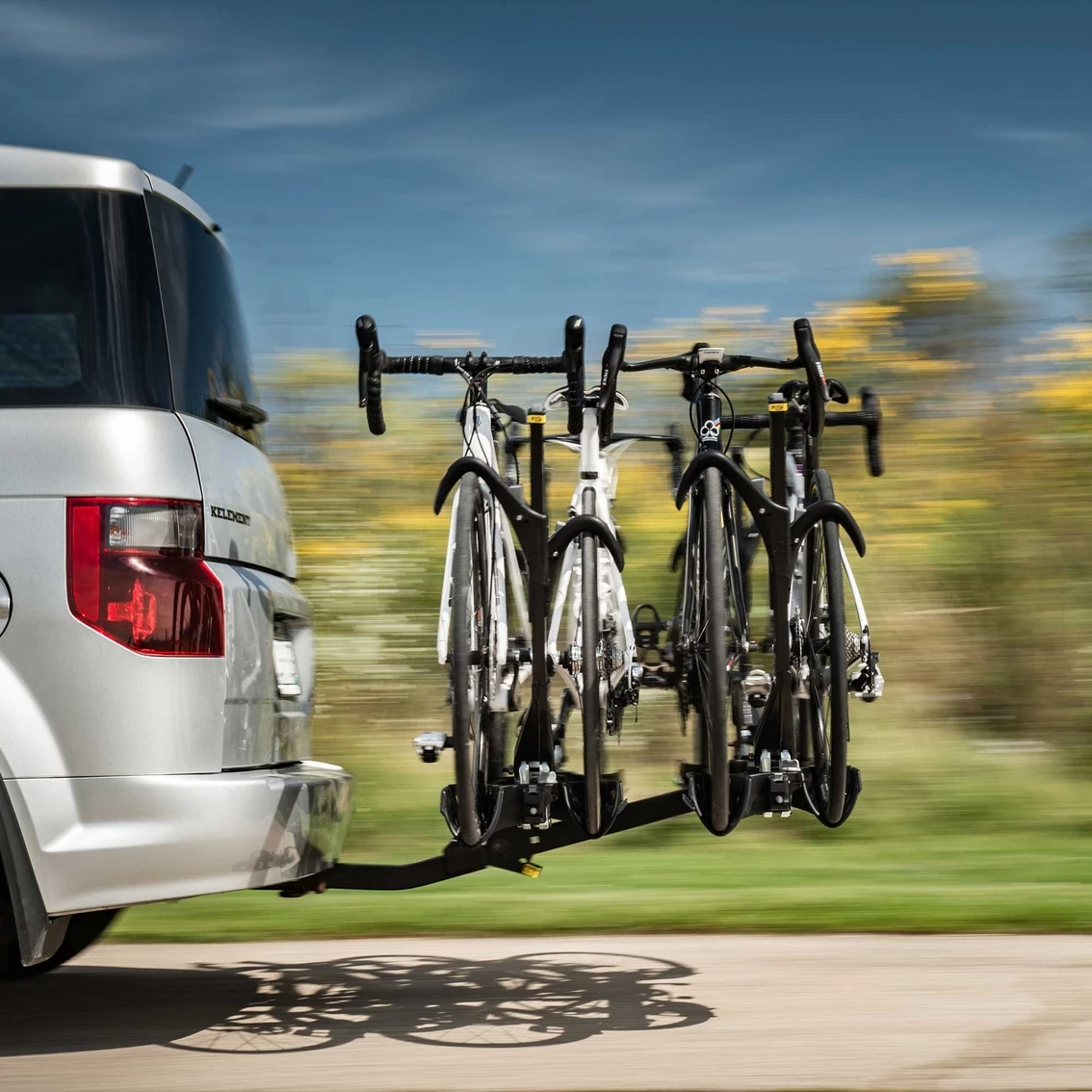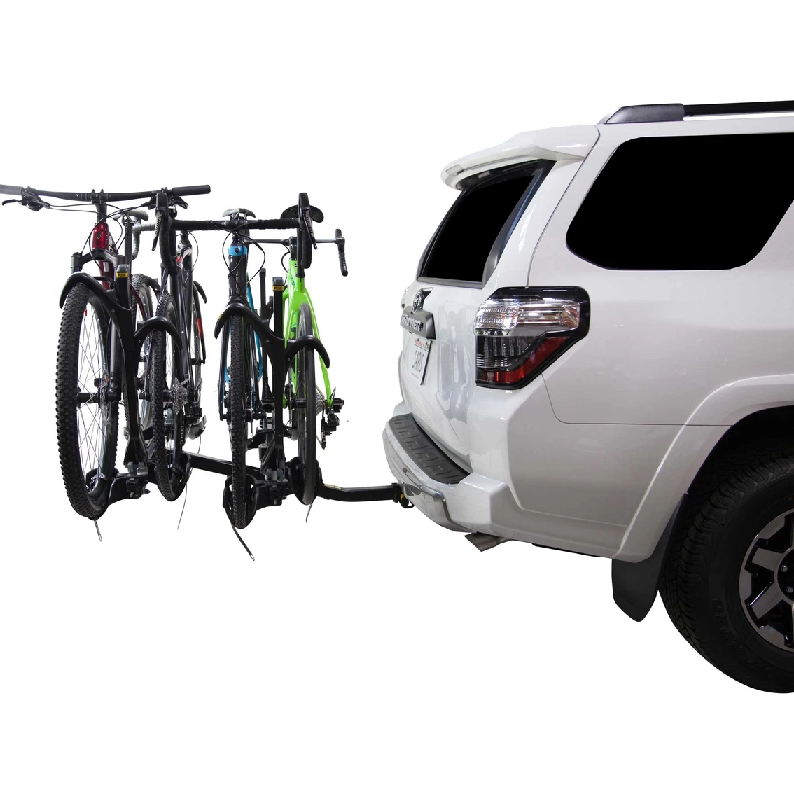 No matter where you go the SuperClamp EX 4-Bike 2-Inch Hitch Mount Bike Rack is up for the challenge. Built ground-up to be the safest, toughest and lightest 4-bike platform hitch rack on the road. Rock-solid dual hooks provide unmatched security and never touch the bike’s frame. Brawny, yet lightweight, it can carry up to four bikes of any type (190 pounds total, with the two outer bikes not exceeding 35 pounds each). Load ’em up! Crafted to haul a wide variety and combination of bikes, including those with wheelbases up to 50 inches. Tilting feature allows access to rear of vehicle, even when fully loaded, and folds up when not in use. Functional eye-pleasing design that looks good on any car. Features integrated locks and reflectors.