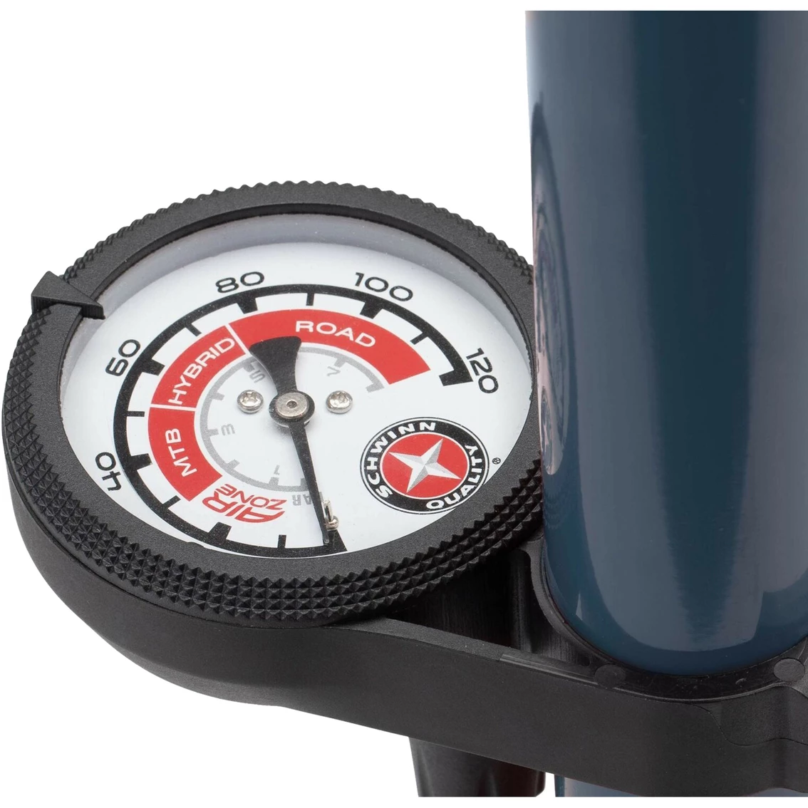 You were all ready to go for a ride and… darn it if your tire doesn’t need a little more air. No worries, you have the 21 in. Air Center Plus Floor Pump with Gauge from Schwinn. Sure, there are plenty of bike pumps out there, but the Air Center Plus has several key features that make it a great asset when you’re in a pinch. There is a wide metal base that keeps it stable and an indicator-style pump head that takes the guess work out of wondering if the pump head is truly attached to the valve. When the handle is up the window is green, meaning it is ready to pump. When the handle is down, the window is red, meaning it isn’t ready to pump. Easy, right? You have the option of a Presta or Schrader valve so all the bikes in the family are covered. With a pump, the height of the barrel is equal to the capacity, which is how much air the pump can push into the tire per pump. With a 21 in. barrel height and a 38 mm diameter steel barrel, you’ll get a nice gust of air with each pump, which means fewer pumps for a fully-inflated tire. There are molded handles for comfort, a convenient mid-level top view gauge that pumps to 120 PSI, and an included sports ball needle and inflation cone for all your pumping needs. Nothing is holding you back, enjoy the ride with a Schwinn. Model: SW79062-3.