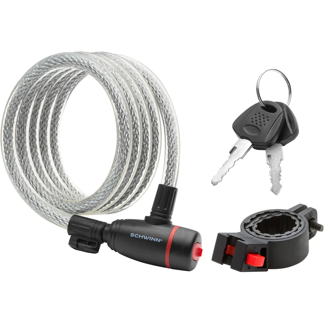 Protect your bike with the 6 ft x 12 mm Key Cable Lock by Schwinn which features steel cable that makes it easy to securely store your ride. Tough, weather-resistant vinyl covers the cable to help protect your bike from scratches and theft. And when youβre ready to go, the self-coiling cable can be neatly tucked away with the included carrying bracket. Enjoy the freedom of riding with Schwinn. Model: SW77779-3.
