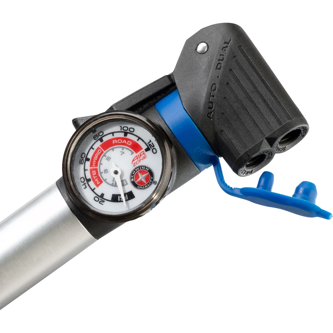 Nothing slows down your ride like a flat tire. Be prepared for flats and keep the ride going with the Air Sport Plus Frame Pump from Schwinn! This handy little frame pump comes with a convenient mounting bracket which lets you clip the pump directly onto your bike frame for easy on-the-go inflation. Since the aluminum pump barrel is lightweight and durable, it won’t weigh you down while you ride. Now you never have to worry about a flat tire again! The convenient dual head nozzle fits both Schrader and Presta valves for all the bikes in the family, and the rotating pump head is crucial for pumping your tires from any angle. The gauge inflates up to 120 PSI and displays different inflation ranges for different types of bikes, so you can pump your tires to the perfect inflation level every time. Lightweight, convenient and versatile, the Air Sport Plus Frame Pump is the perfect enhancement to your ride. Enjoy the freedom of riding with Schwinn.