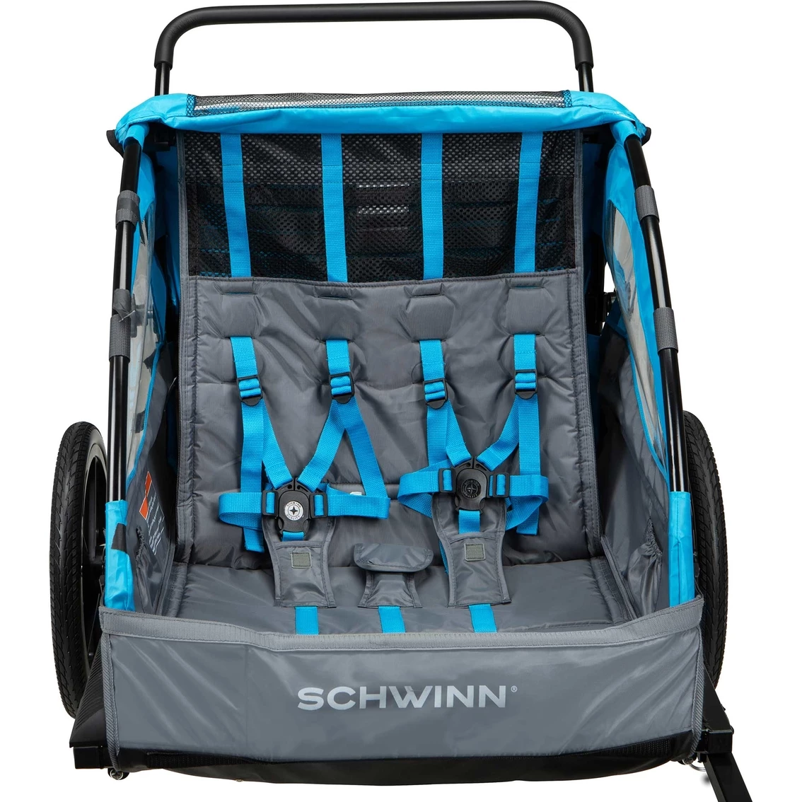 Take the whole family on a ride with the Convoy bike trailer by Schwinn. This bike trailer seats two child passengers and includes a stroller kit for added convenience. The 5-point safety harnesses help keep your passengers secure, while the 2-in-1 canopy offers protection from the elements. Plus, the folding frame makes compact storage a breeze. Enjoy the freedom of riding with Schwinn.