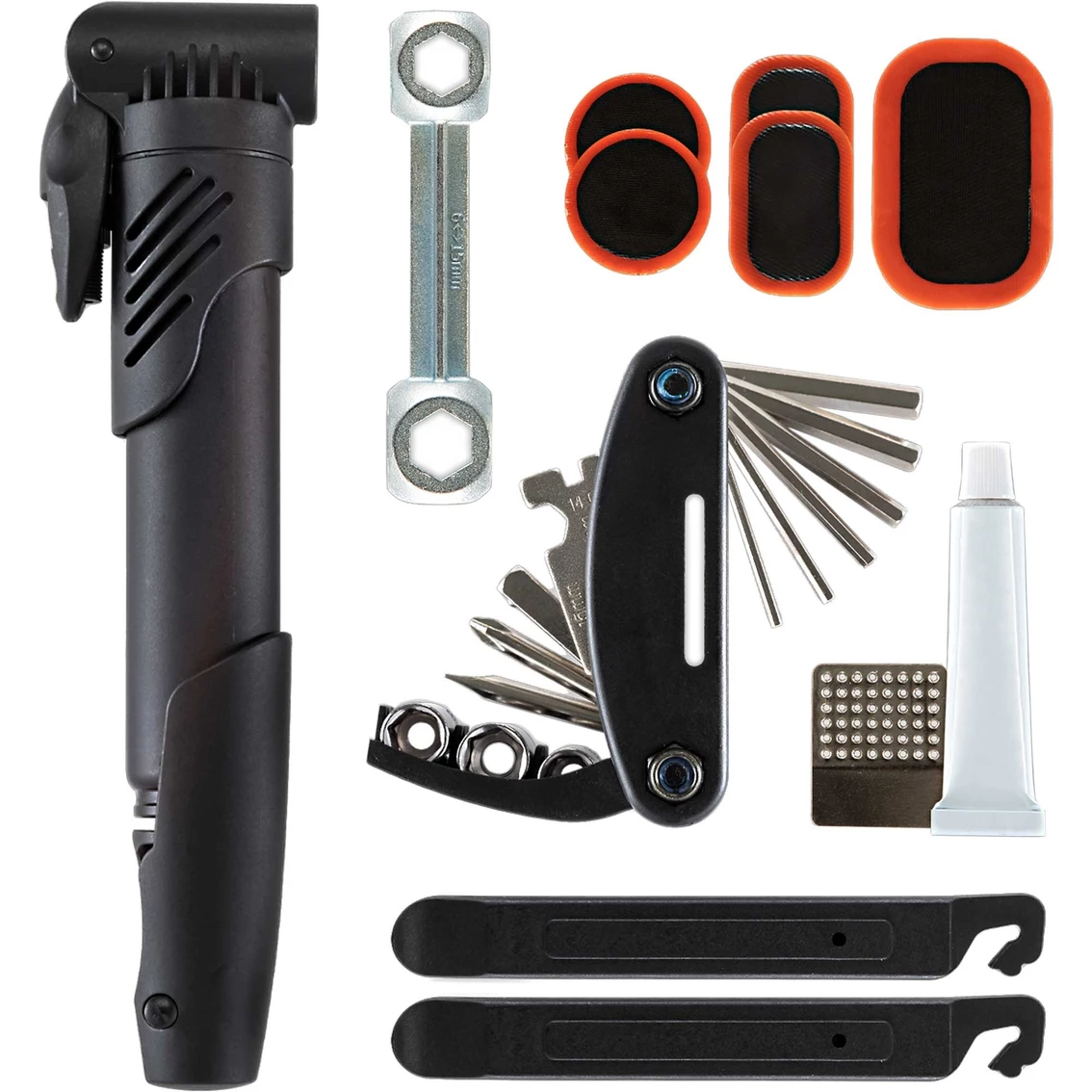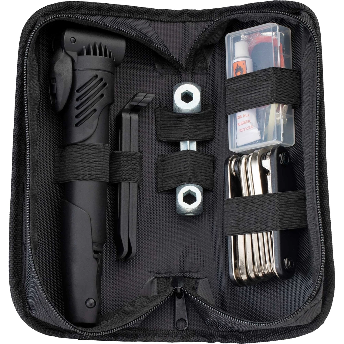 Never be caught without the right tools again! The Schwinn Emergency Repair Kit for bicycles makes it easy to perform roadside repairs. This 12-piece kit includes an expanding mini pump, 15-in-1 multi-tool, 10-function wrench, 2 tire levers, and a tube patch kit. Plus, it all comes in a convenient carrying case. Upgrade your ride with the Emergency Repair Kit and enjoy the freedom of riding with Schwinn. Model: SW80323-6.