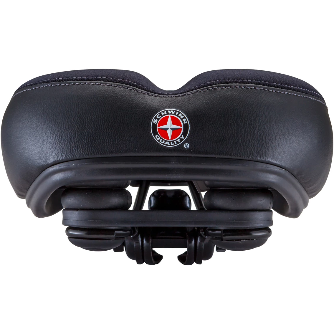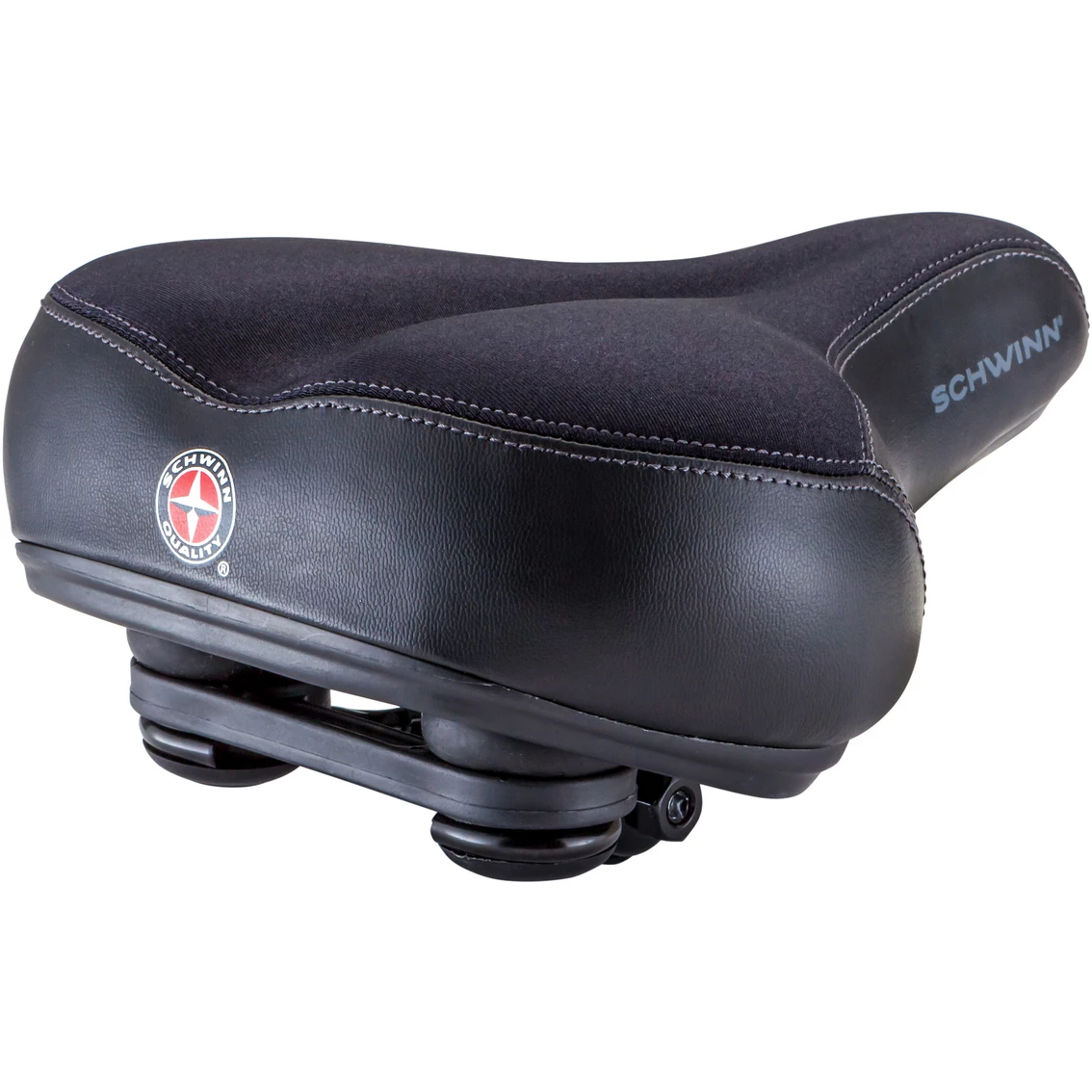 Give your ride a comfort upgrade with the Commuter Gateway Foam Comfort Seat from Schwinn. The seat interior is made of high-density foam padding that offers a more cushioned, comfortable ride. The elastomer springs underneath the seat absorb bumps for smoother weekend jaunts. Don’t fret if you get caught in the rain. The breathable, stretchy Lycra cover material keeps your rear cool and dry. As an added bonus, the saddle conveniently attaches to the seat post of any bike. Comfortable, secure and sure to last, the Commuter Gateway Foam Comfort Seat is exactly what your ride is missing. Enjoy the freedom of riding with Schwinn. Easy assembly with the use of a 14 mm or adjustable wrench. Model: SW79047-2.