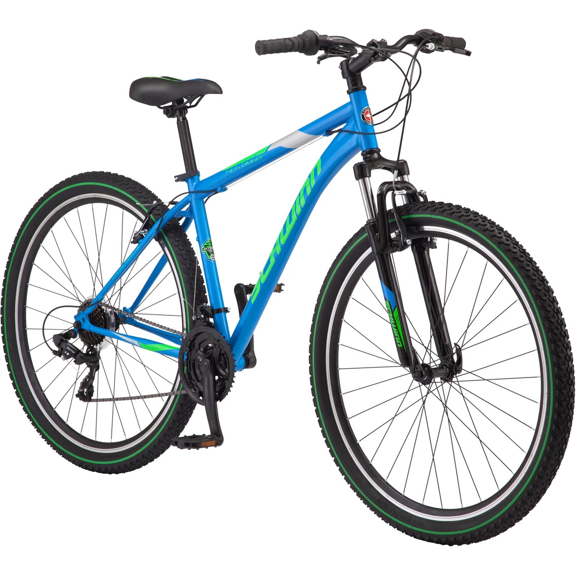 Agile and resilient, the Schwinn High Timber 29 In. front suspension mountain bike can be ridden easily on a wide variety of terrain thanks to responsive handling, large stable tires and a comfortable but athletic riding position.