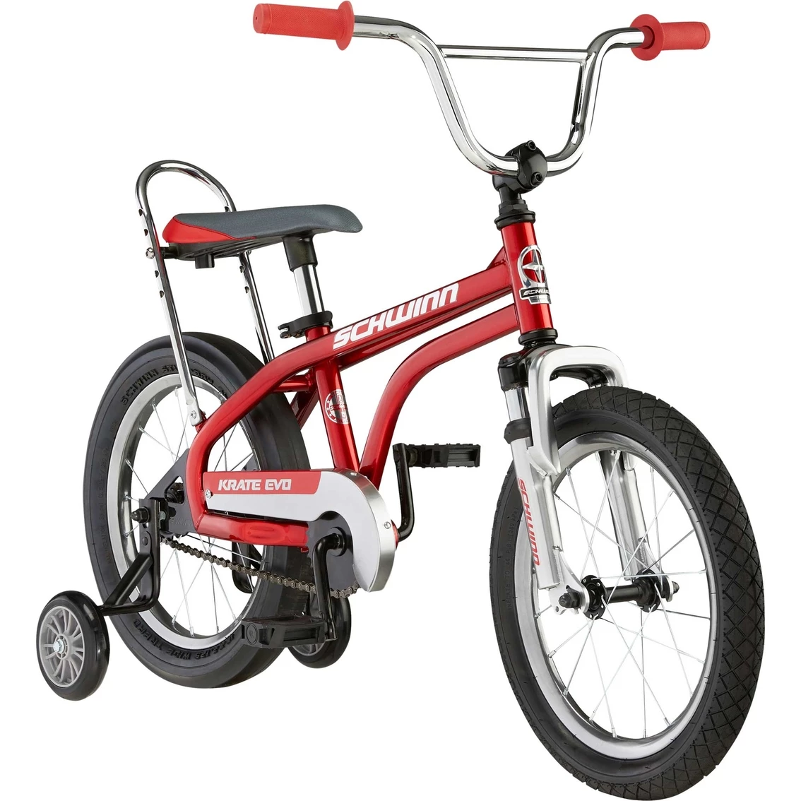 Adventure has a new name. From learning to ride to racing down the sidewalk, outdoor fun is just a pedal away with the Krate EVO kids bike by Schwinn. The Krate EVO blends classic style with modern technology for a ride thatโs as iconic as it is comfortable. The steel frame features a double top tube and Sting-Ray inspired shapes, while the SmartStart geometry offers kids a better fit for a more stable, confidence-boosting ride. But we didnโt stop there. The fully functional suspension fork, re-imagined racing bucket-style saddle, and authentic Slik rear tire put a fresh twist on that classic 70โs Krate look. The single speed drivetrain, rear coaster (pedal) brake, and removable skate-style training wheels make this bike simple and intuitive for young riders to use. Like all Schwinn bikes, the Krate EVO comes with a limited lifetime warranty for as long as you own the bike. Teach your child to ride and make memories together with the Krate EVO. Enjoy the freedom of riding a Schwinn. 16-inch wheels fits kids ages 3 to 5, or 38 to 48 inches tall.